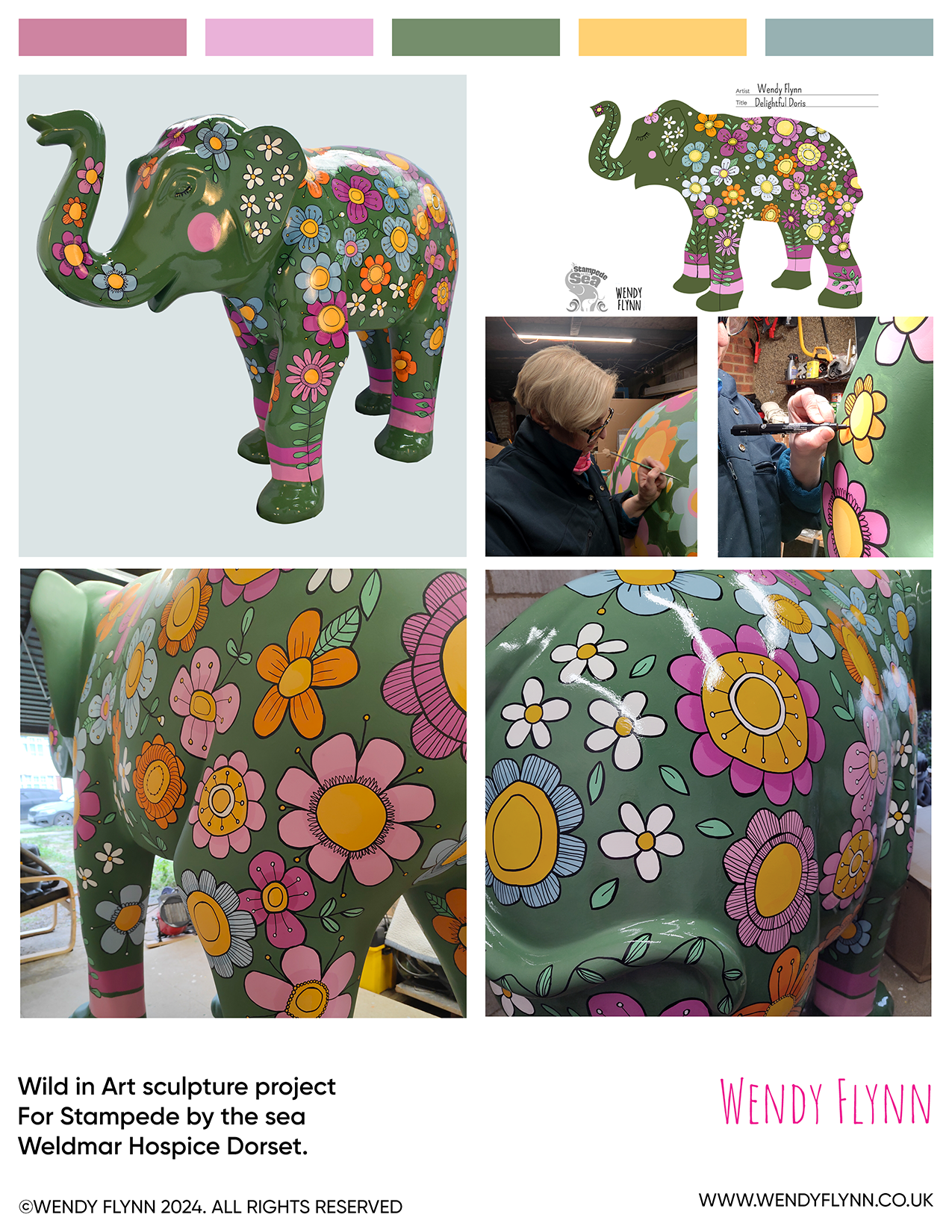 This is Delightful Doris, a Wild in Art project I was commissioned to paint in aid of Weldmar Hospice in Dorset. She is on display in Bridport in Spring 2025 as part of the Stampede by the Sea public art trail.